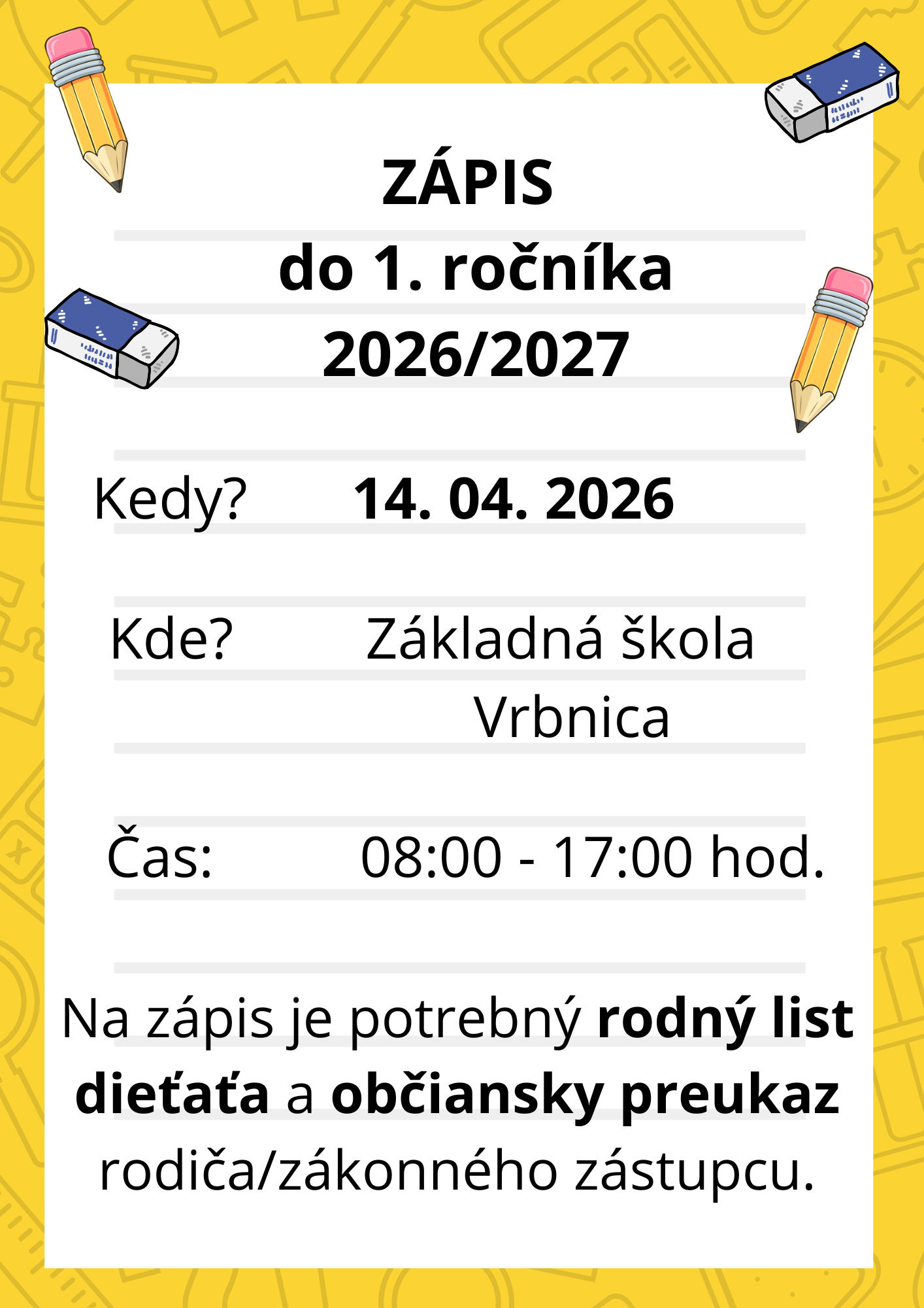 OZNAM O ZÁPISE DETÍ DO ZÁKLADNEJ ŠKOLY VRBNICA na školský rok 2026/2027